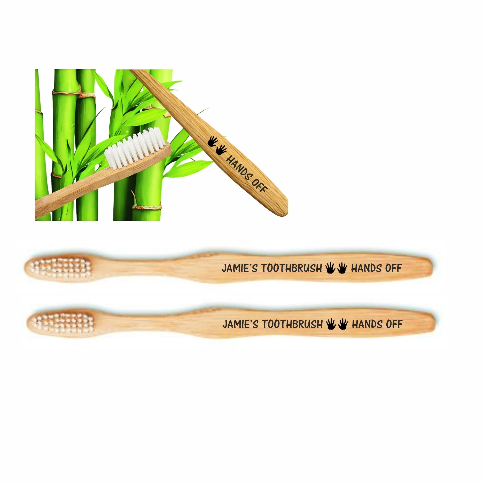 ·2 x Personalised bamboo toothbrushes printed with any name of your choice and our HANDS OFF logo.
